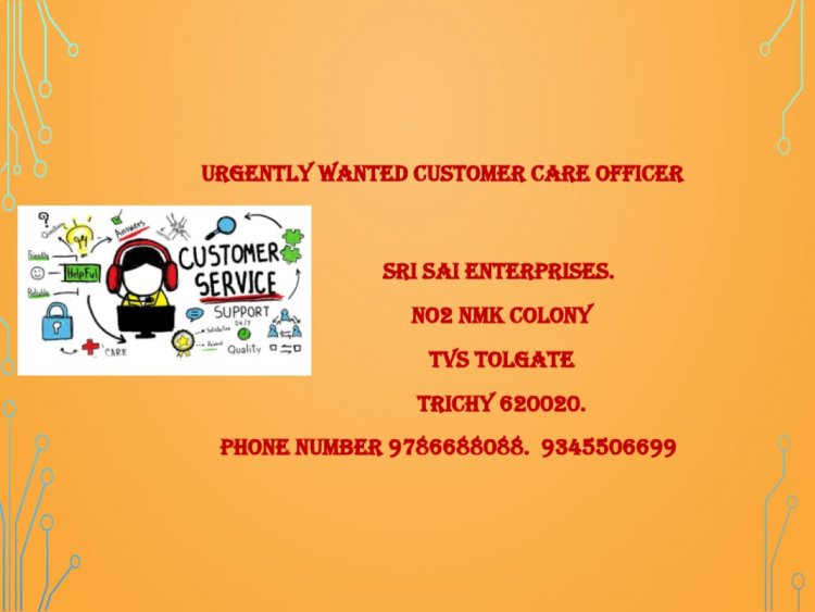 திருச்சியில் செயல்பட்டு வரும் ஶ்ரீ சாய் என்டர்பிரைசஸ் நிறுவனத்தில் கஸ்டமர் கேர் அதிகாரி பணியிடத்திற்கு வேலை வாய்ப்புகள் அறிவிக்கப்பட்டுள்ளது. மேலும் விபரங்களுக்கு கீழே உள்ள படத்தை பார்க்கவும்.