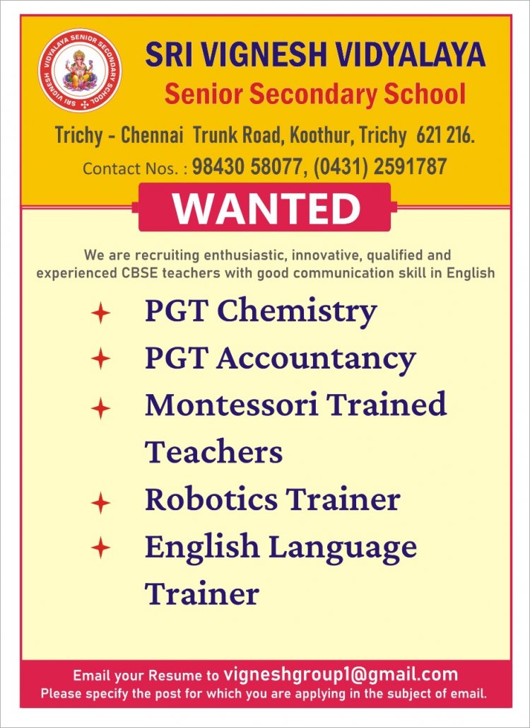 திருச்சியில் செயல்பட்டு வரும் ஸ்ரீ விக்னேஷ் வித்யாலயா பள்ளியில் கீழ்க்கண்ட பிரிவுகளில் உள்ள பணியிடங்களுக்கு வேலைவாய்ப்புகள் அறிவிக்கப்பட்டு உள்ளன. மேலும் தகவல்களுக்கு கீழே உள்ள படத்தை பார்க்கவும்.