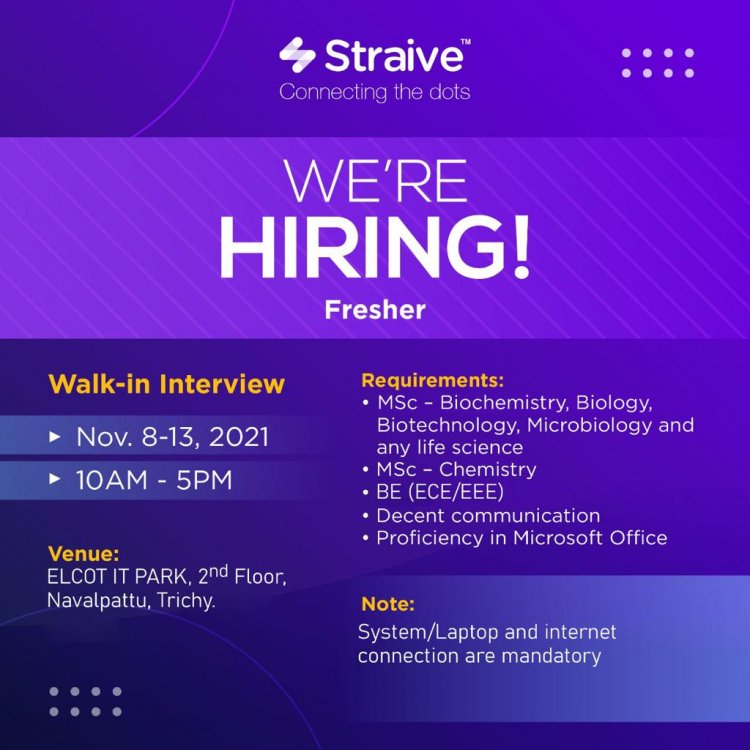 திருச்சி Straive நிறுவனத்தில் பல்வேறு பிரிவுகளில் பணியிடங்களுக்கான வேலை வாய்ப்புகள் அறிவிக்கப்பட்டுள்ளது. மேலும் தகவல்களுக்கு கீழே உள்ள படத்தை பார்க்கவும்.