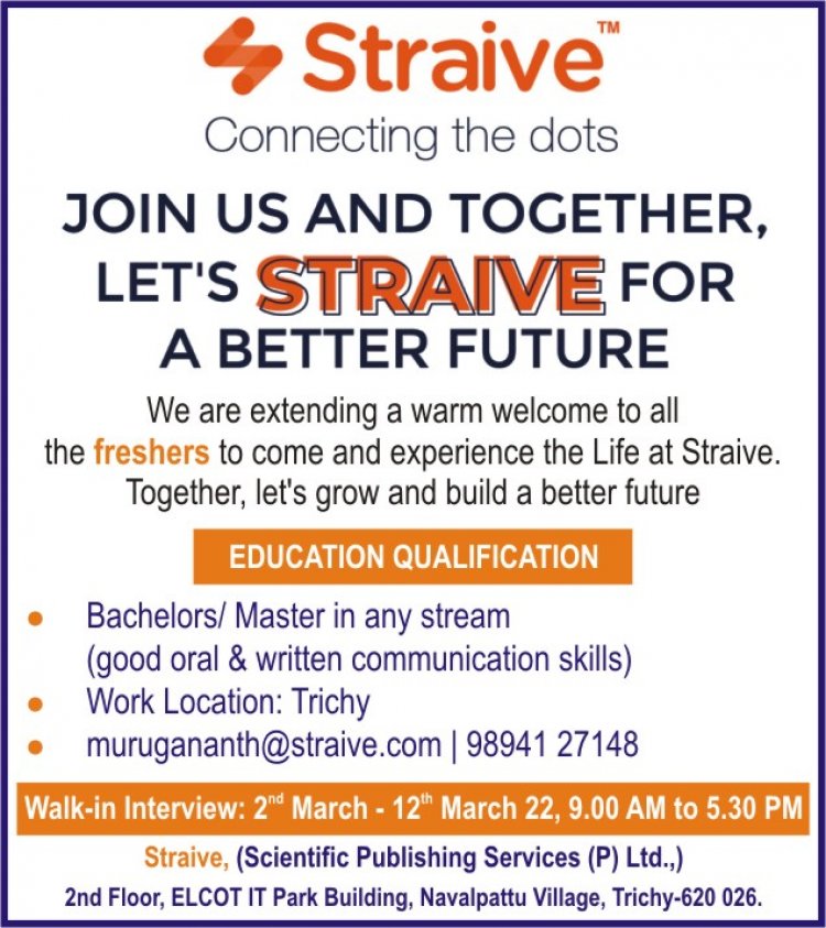 திருச்சியில் செயல்பட்டு வரும் Straive நிறுவனத்தில் கீழ்கண்ட பல்வேறு பணியிடங்களுக்கு வேலை வாய்ப்புகள் அறிவிக்கப்பட்டுள்ளது. மேலும் விபரங்களுக்கு கீழே உள்ள படத்தை பார்க்கவும்.
