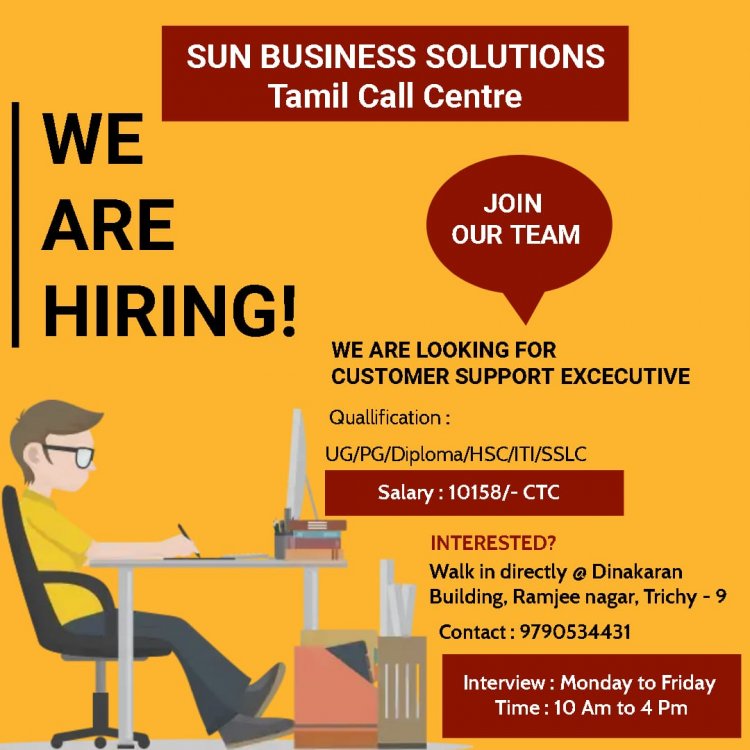 திருச்சியில் செயல்பட்டு வரும் SUN BUSSINESS SOLUTIONS நிறுவனத்தில் வேலை வாய்ப்புகள் அறிவிக்கப்பட்டுள்ளது. மேலும் விபரங்களுக்கு கீழே உள்ள படத்தை பார்க்கவும்.