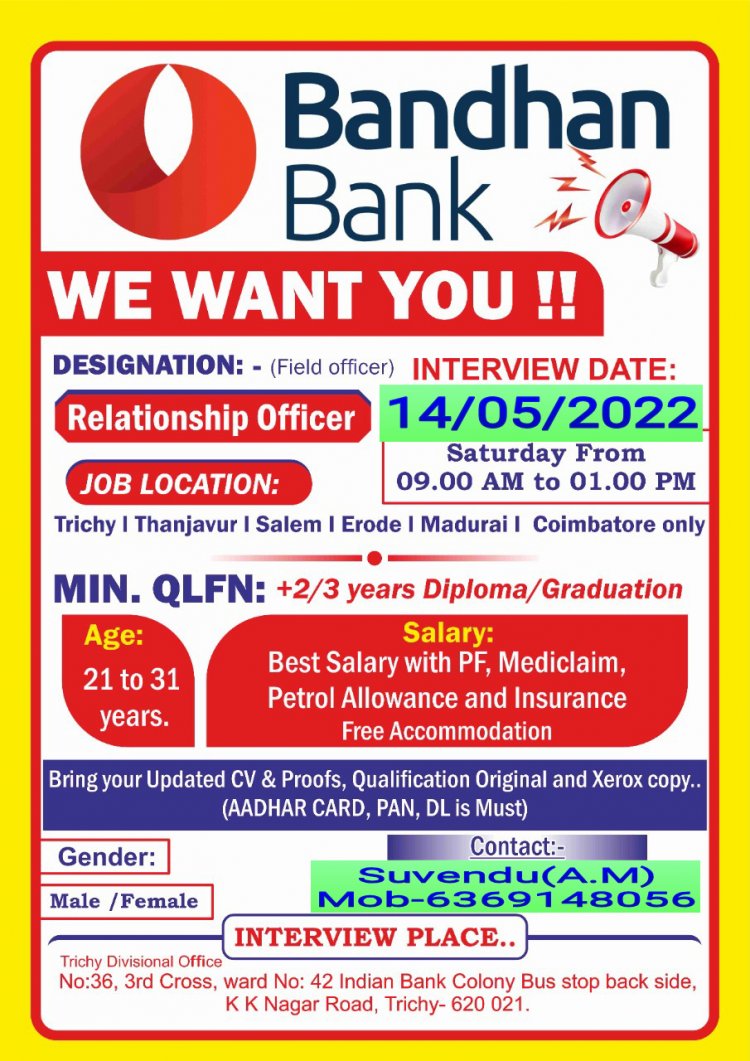 Bandhan Bank இல் பணிப்புரிய வேலைவாய்ப்புகள்அறிவிக்கப்பட்டுள்ளன நேர்காணல் வருகின்ற 14. 05.2022 சனிக்கிழமை நடைப்பெற உள்ளது. மேலும் விவரங்களுக்கு கீழ்காணும் படத்தை காணவும்.