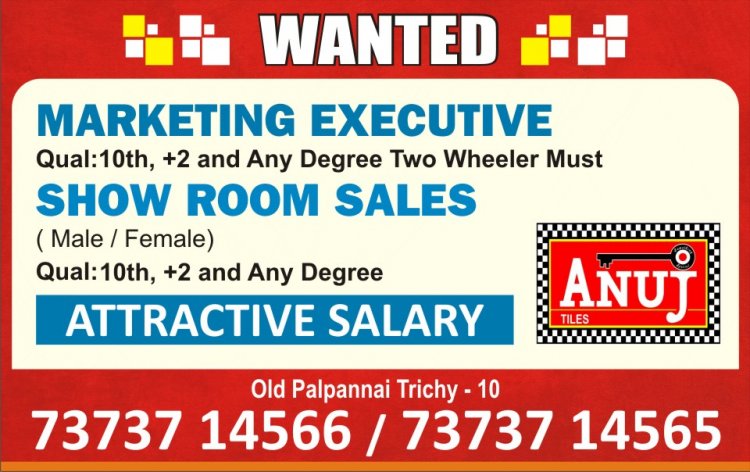 திருச்சியில் செயல்பட்டு வரும் அனுஜ் டைல்ஸ் நிறுவனத்தில் பல்வேறு பிரிவுகளில் பணியிடங்களுக்கான வேலை வாய்ப்புகள் அறிவிக்கப்பட்டுள்ளது. மேலும் விபரங்களுக்கு கீழே உள்ள படத்தை பார்க்கவும்.
