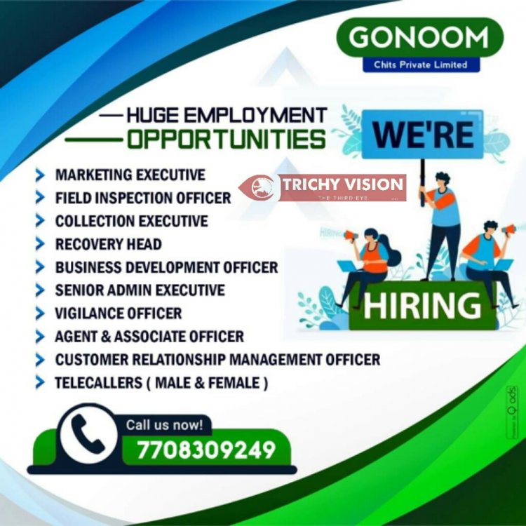 திருச்சி GONOOM Chits Praivate Limited நிறுவனத்தில் பல்வேறு பிரிவுகளின் பணிபுரிய வேலை வாய்ப்புகள் அறிவிக்கப்பட்டுள்ளன. மேலும் தொடர்புக்கு கீழே உள்ள படத்தை பார்க்கவும்.