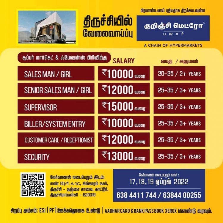 திருச்சி தஞ்சை சாலையில் உள்ள காட்டூரில் இயங்கி வரும் குறிஞ்சி மெட்ரோ பஜார் சூப்பர் மார்க்கெட்டிற்கு பல்வேறு பிரிவுகளில் உள்ள பணியிடங்களுக்கான வேலைவாய்ப்புகள் அறிவிக்கப்பட்டுள்ளன.