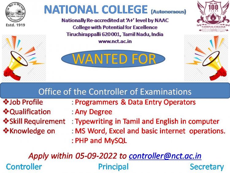 திருச்சியில் செயல்பட்டு வரும் தேசிய கல்லூரி தன்னாட்சி வேலைவாய்ப்புகள் அறிவிக்கப்பட்டுள்ளன. மேலும் விவரங்களுக்கு கீழே உள்ள படத்தை பார்க்கவும்.
