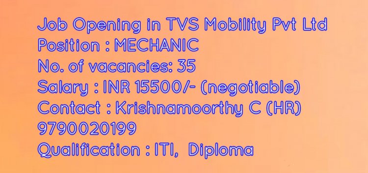 TVS Moblility Pvt Ltd நிறுவனத்தில் 35 மெக்கானிக் பணியிடத்திற்கு வேலை வாய்ப்புகள் அறிவிக்கப்பட்டுள்ளது.
