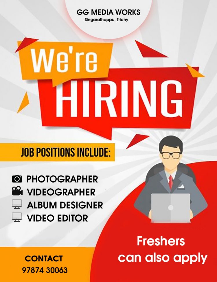 திருச்சி மாநகரில் செயல்பட்டு வரும் GG MEDIA WORKS நிறுவனத்தில் கீழ்கண்ட பணியிடங்களுக்கு வேலை வாய்ப்புகள் அறிவிக்கப்பட்டுள்ளது. மேலும் விபரங்களுக்கு கீழே உள்ள படத்தை பார்க்கவும்.