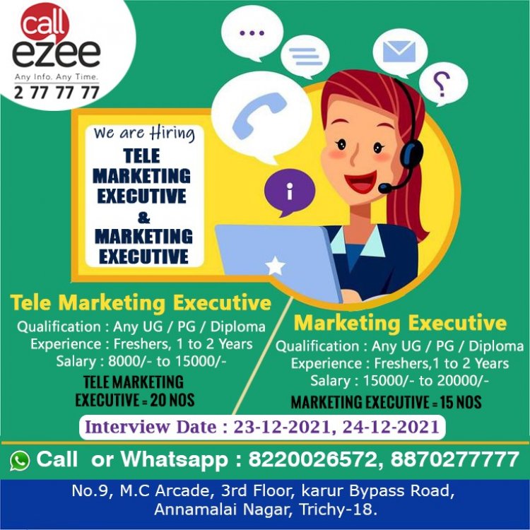 திருச்சியில் செயல்பட்டு வரும் call ezee நிறுவனத்தில் கீழ்கண்ட பணியிடங்களுக்கு வேலை வாய்ப்புகள் அறிவிக்கப்பட்டுள்ளது. மேலும் விபரங்களுக்கு கீழே உள்ள படத்தை பார்க்கவும்.