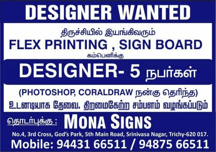 திருச்சியில் செயல்பட்டு வரும் MONA SIGNS நிறுவனத்தில் பல்வேறு பிரிவுகளுக்கு வேலை வாய்ப்புகள் அறிவிக்கப்பட்டுள்ளது. மேலும் விபரங்களுக்கு கீழே உள்ள படத்தை பார்க்கவும்.
