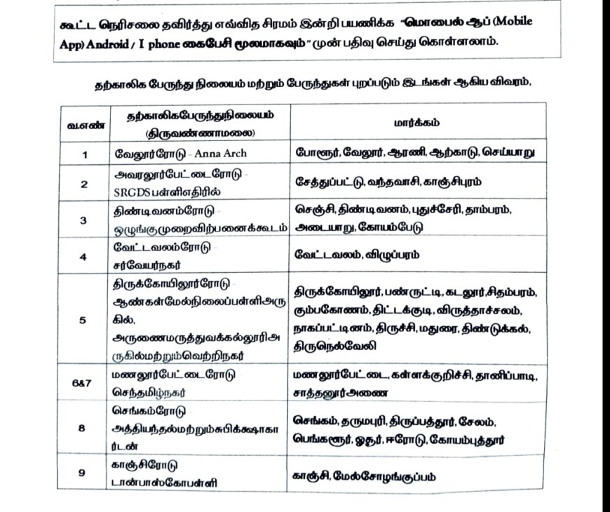 திருவண்ணாமலை நகரில் போக்குவரத்து நெரிசலை தவிர்ப்பதற்காக 9 தற்காலிக பேருந்து நிலையங்கள் கீழ்க்கண்டவாறு அமைக்கப்பட்டுள்ளன. மேலும் தற்காலிக பேருந்து நிலையத்திலிருந்து பக்தர்கள் கிரிவலப்பாதை சென்று திரும்பிவருவதற்கு வசதியாக சிற்றுந்துகள் வசதியும் ஏற்படுத்தப்பட்டுள்ளது