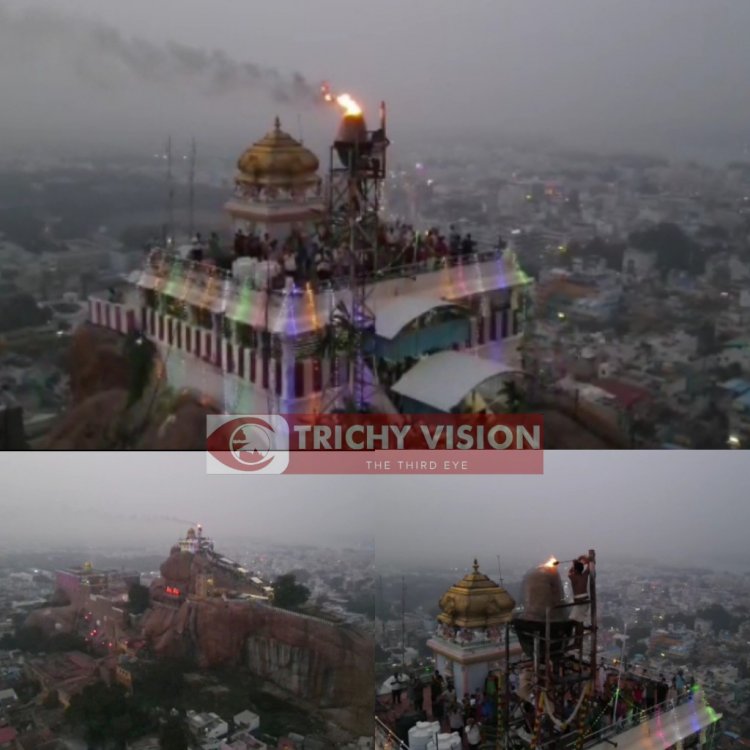 பின்னர் சிறப்பு பூஜைகள் செய்து மேளதாளங்கள் முழங்க வான வேடிக்கையுடன் தாயுமானவர் சன்னதி அருகே இருந்து எடுத்து வரப்படும் தீபத்தை கார்த்திகை தீப கோபுரத்தில் உள்ள திரியில் வைத்து ஆறு மணிக்கு மகா தீபம் ஏற்றப்பட்டது. இதற்காக நேற்று தாயுமான சாமி சன்னதியில் பரணி தீபம் ஏற்றப்பட்டது. மலை உச்சியில் இன்று ஏற்றப்பட்ட கார்த்திகை தீபம் தொடர்ந்து மூன்று நாட்களுக்கு தொடர்ந்து எரியும். இந்த தீபத்தை மலைக்கோட்டை சுற்றியுள்ள சுமார் 5 கிலோமீட்டர் தொலைவு வரை உள்ள மக்கள் பார்க்க முடியும். இதற்கான ஏற்பாடுகளை கோவில் அதிகாரிகள் பணியாளர்கள் செய்துள்ளனர்.