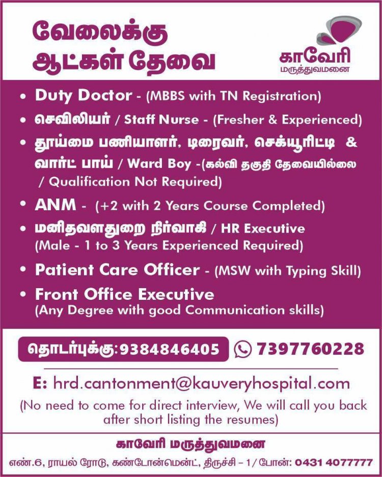 திருச்சி கண்டோன்மென்ட் ராயல் ரோடு பகுதியில் இயங்கி வரும் காவேரி மருத்துவமனையில் பணிபுரிய கீழ்கண்ட பதவிகளுக்கு தகுதிக்குரிய நபர்கள் விண்ணப்பிக்கவும். Duty Doctor , செவிலியர், தூய்மைப் பணியாளர், வார்டு பாய், ANM, மனித வளத்துறை அதிகாரி ,நோயாளிகள் பராமரிப்பு அலுவலர்,முன் அலுவலக எக்ஸிக்யூட்டிவ் உள்ளிட்ட பதவிகளுக்கு அந்தந்த துறையில் படித்த அனுபவம் உள்ளவர்கள் மருத்துவமனையின் இமெயில் முகவரிக்கு தங்களது விண்ணப்பங்களை அனுப்பலாம்.