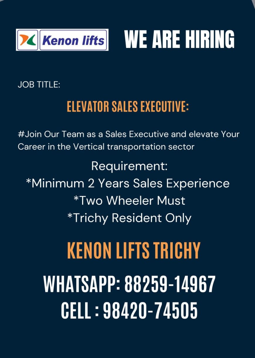 திருச்சியில் செயல்பட்டு வரும் Kenon Lifts நிறுவனத்தில் கீழ்க்கண்ட பணியிடத்திற்கு வேலை வாய்ப்புகள் அறிவிக்கப்பட்டுள்ளது. மேலும் விபரம் மற்றும் தொடர்புக்கு கீழே உள்ள படத்தை பார்க்கவும்.