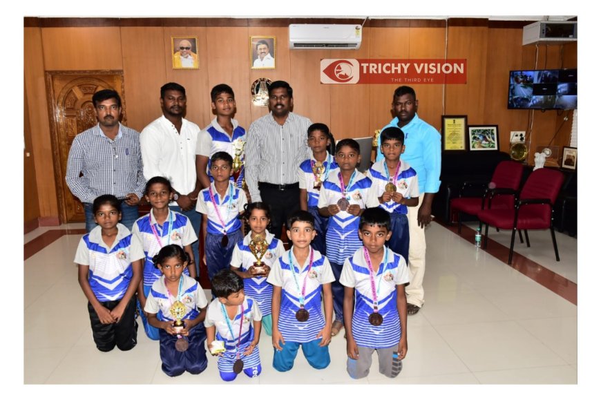 அதில் பதக்கங்கள் மற்றும் கோப்பைகள் பெற்று திருச்சி மாவட்டத்திற்கு பெருமை சேர்த்த மாணவ / மாணவிகளை மாவட்ட ஆட்சியர் M.பிரதீப் குமார் மற்றும் மாவட்ட விளையாட்டு அலுவலர் ஆண்டனி ஜோயல் பிரபு மற்றும் மாவட்ட விளையாட்டு ஆய்வாளர் சரோஜினி மற்றும் மாவட்ட விளையாட்டு விடுதி அலுவலர் சுகந்தி ஆகியோர் வாழ்த்தினார்.