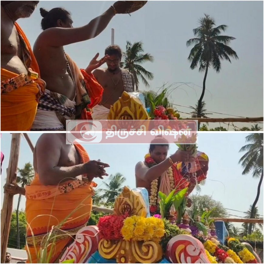 வேத விற்பனர்கள் வேத மந்திரங்கள் முழங்க யாக சாலையில் பூஜை நடைபெற்றது. இன்று காலை 7 மணிக்கு யாக சாலையில் இரண்டாம் கால பூஜையை தொடர்ந்து மகா பூர்ணா நதி நடைபெற்றது. இதனைத் தொடர்ந்து தீபாரதனையும் நடைபெற்றது. பின்னர் காவிரி ஆற்றில் இருந்து எடுத்துவரப்பட்ட புனித நீரை வேத மந்திரங்கள் முழங்க கோவிலின் கலசத்திற்கு 9 மணிக்கு மேளதாளங்கள் முழங்க எடுத்து சென்றனர்.
