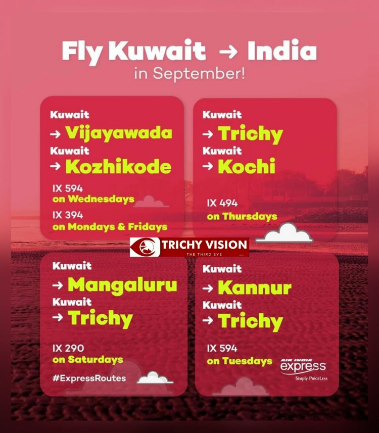 குவைத் – கண்ணூர் – திருச்சி இடையிலான விமான சேவை செவ்வாய் கிழமைகளிலும் இயங்கும் என்று அந்நிறுவனம் தெரிவித்திருக்கிறது.