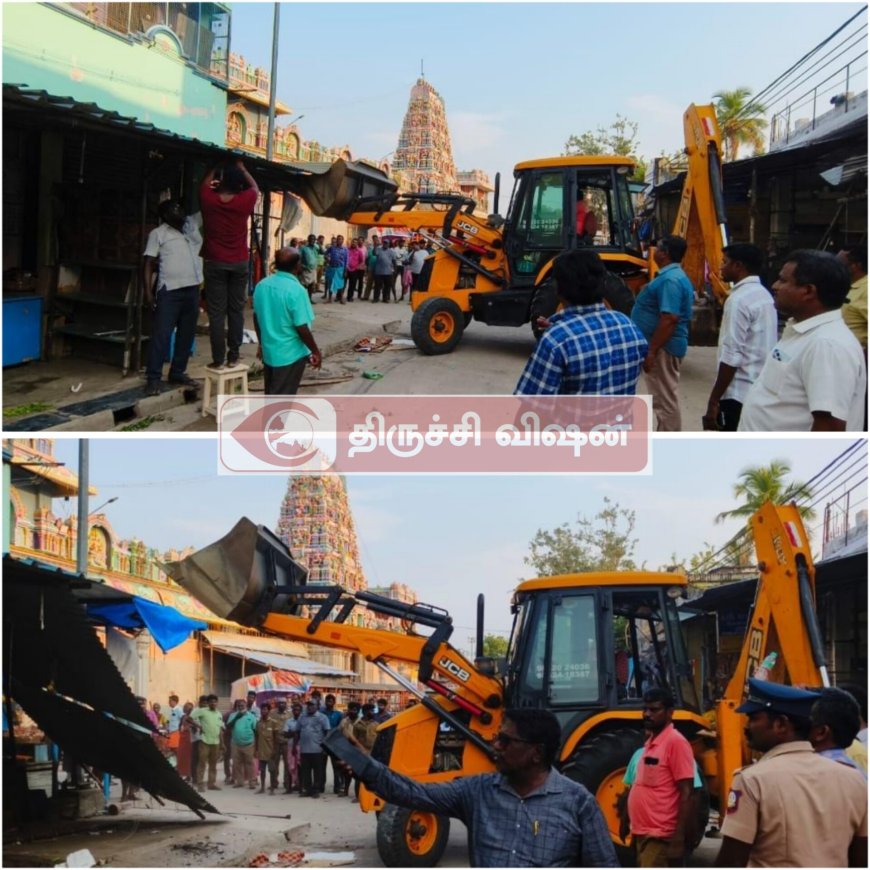 திருச்சி சமயபுரத்தில் ஆக்கிரமித்து அமைக்கப்பட்டிருந்த கடைகள் அகற்றம் -லால்குடி வருவாய் கோட்டாட்சியர் அதிரடி