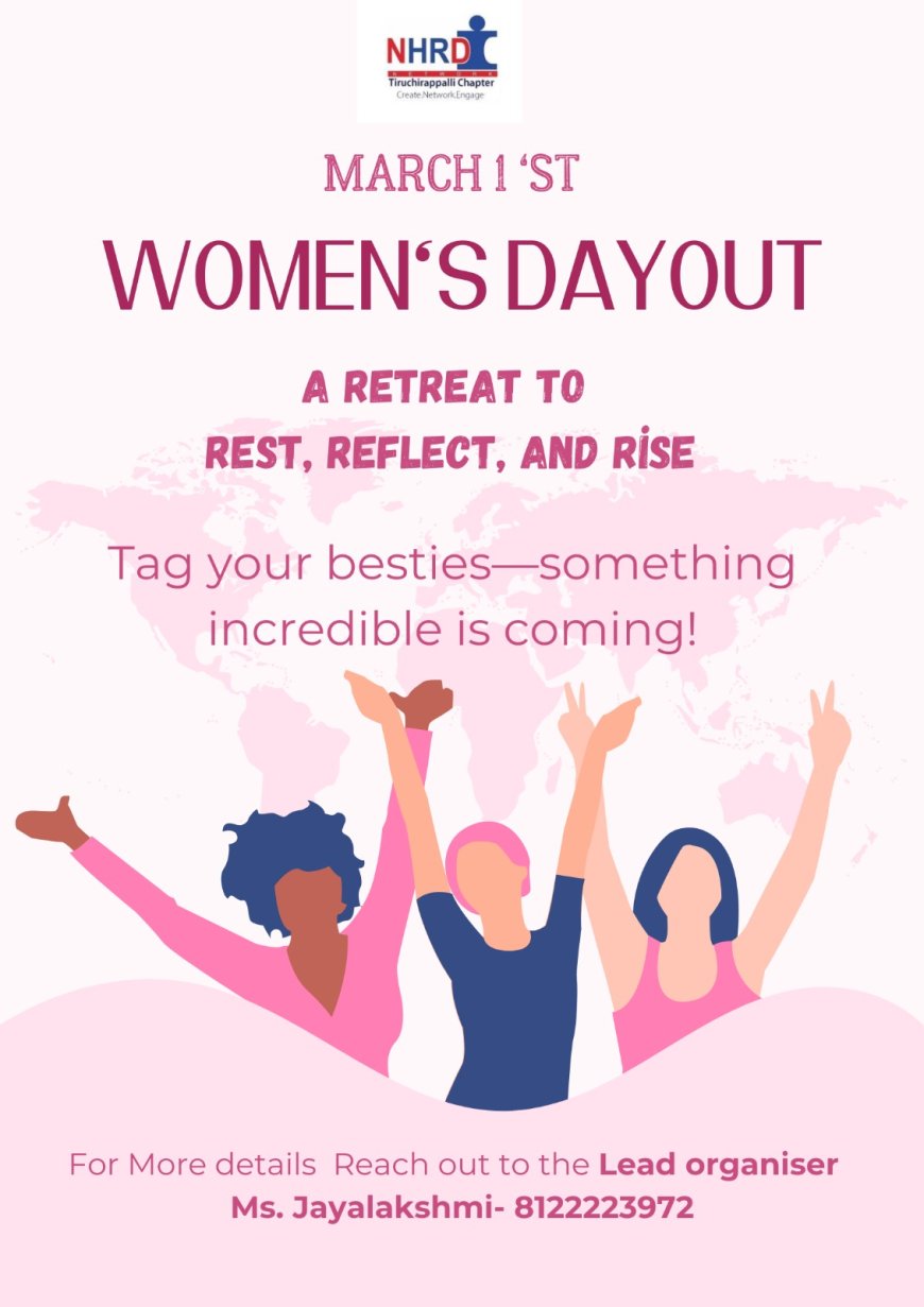 விருதுகள் பாராட்டுகளை தாண்டி பெண்கள் தங்களுக்கான நேரத்தை செலவிடும் விதமாக அவர்களை புத்துணர்வாக்கும் வகையில் திருச்சி NHRD சார்பில் நிகழ்ச்சி ஏற்பாடு செய்யப்பட்டுள்ளது. இந்நிகழ்ச்சியில் பணிபுரியும் அனைத்து பெண்களும் கலந்து கொண்டு தங்களுக்குரிய நேரத்தை எவ்வாறு செலவிட வேண்டும்.