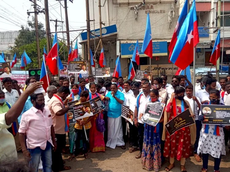 பொதுத்துறை நிறுவனங்கள், மத்திய அரசு பணியில் எஸ்சி, எஸ்டி ஓபிசி இடத்துக்கீட்டில் முன்னேறிய பிரிவினருக்கு 10 சத இட ஒதுக்கீடு வழங்குவதை கண்டித்தும், அரசு பள்ளி மாணவர்களுக்கு மருத்துவ படிப்பில் 7.5 சதவீத இட ஒதுக்கீடு வழங்க வேண்டும், மனு தர்ம நூலை தடை செய்ய வலியுறுத்தியும் அண்ணா சிலை அருகே விடுதலை சிறுத்தைகள் கட்சியின் தொழிலாளர் விடுதலை முன்னணியின் மாநில துணைச்செயலாளர் பிரபாகரன் தலைமையில் நூற்றுக்கும் மேற்பட்ட விசிகவினர் ஆர்ப்பாட்டத்தில் ஈடுபட்டனர்.