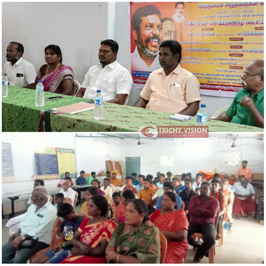 வருகிற ‘டிசம்பர் 23ஆம் தேதி திருச்சி சிறுகனூரில் நடைபெற உள்ள வெல்லும் ஜனநாயக மாநாடு குறித்து விடுதலைச் சிறுத்தைகள் கட்சியினர் மண்ணச்சநல்லூர் கிழக்கு ஒன்றிய சார்பில் ஆலோசனை கூட்டம் நடைபெற்றது. திருச்சி மாவட்டம் மண்ணச்சநல்லூர் அரசு ஆண்கள் மேல்நிலைப் பள்ளி அருகே கள்ளி வனத்தாயம்மன் கோயிலில் உள்ள மண்டபத்தில் மண்ணச்சநல்லூர் கிழக்கு ஒன்றிய துரை மாரியப்பன் தலைமையில் நடைபெற்றது.