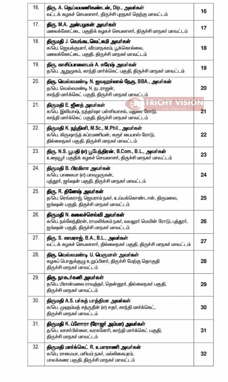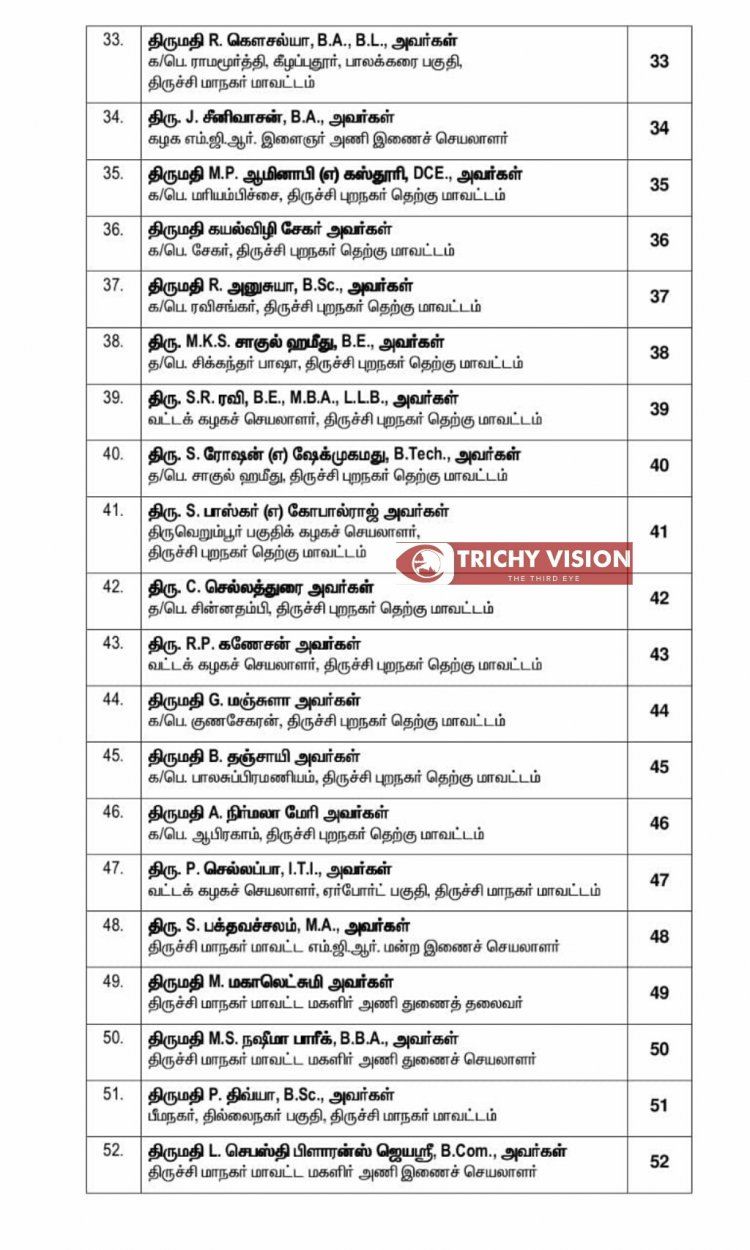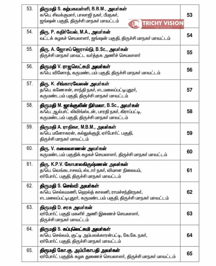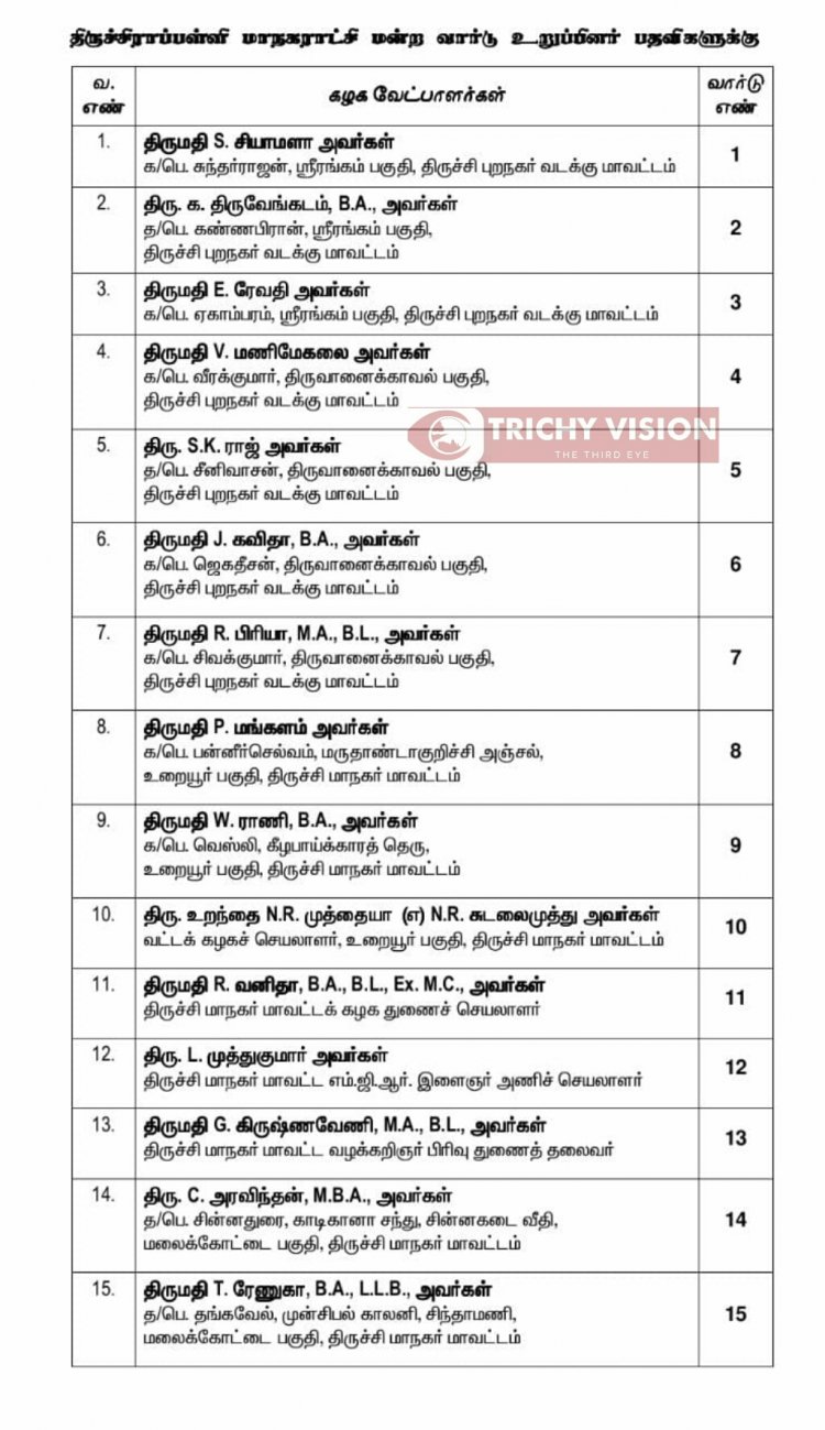 திருச்சி மாநகராட்சி 65 வார்டுகளில் போட்டியிடும் அதிமுக வேட்பாளர் பட்டியல்