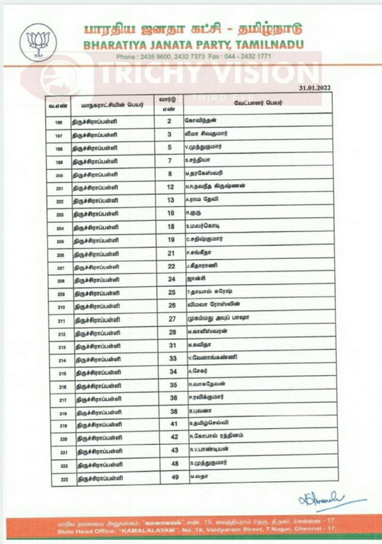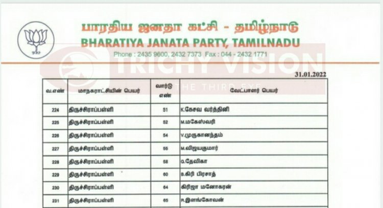 நகர்ப்புற உள்ளாட்சி தேர்தல் வரும் 19ம் தேதி நடைபெற உள்ள நிலையில் திருச்சி மாநகராட்சிக்குட்பட்ட 65 வார்டுகளில் பாஜக கட்சி தனித்து போட்டியிடுகிறது. இந்த வார்டுகளில் போட்டியிடும் வேட்பாளர்கள் பெயர் மற்றும் வார்டுகளுடன் பாஜக தலைமை வெளியிட்டுள்ளது.