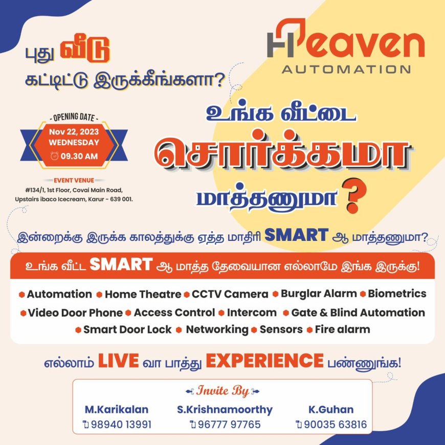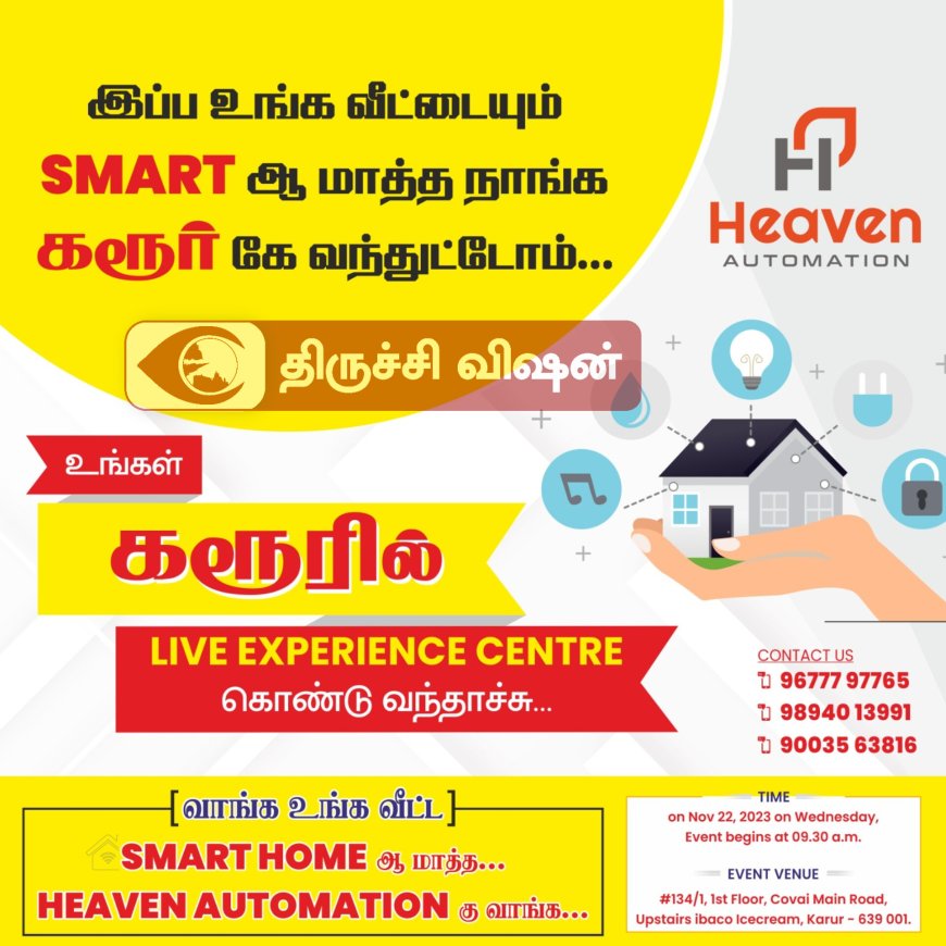 திருச்சியை தலைமை இடமாகக் கொண்ட ஹெவன் ஆட்டோமேஷன் நிறுவனம் தற்போது கரூரில் தங்களை புதிய கிளையை தொடங்கியுள்ளனர். இன்றைய காலகட்டத்திற்கு ஏற்றவாறு வீட்டை ஸ்மார்ட் ஹோம் ஆக மாற்றவே அனைவரும் எண்ணுகின்றனர். வீட்டுக்கு தேவையான அனைத்து ஆட்டோ மேஷன்களையும் செய்து தரும் நிறுவனமாக ஹெவன் ஆட்டோமேஷன் நிறுவனம் செயல்பட்டு வருகின்றது.
