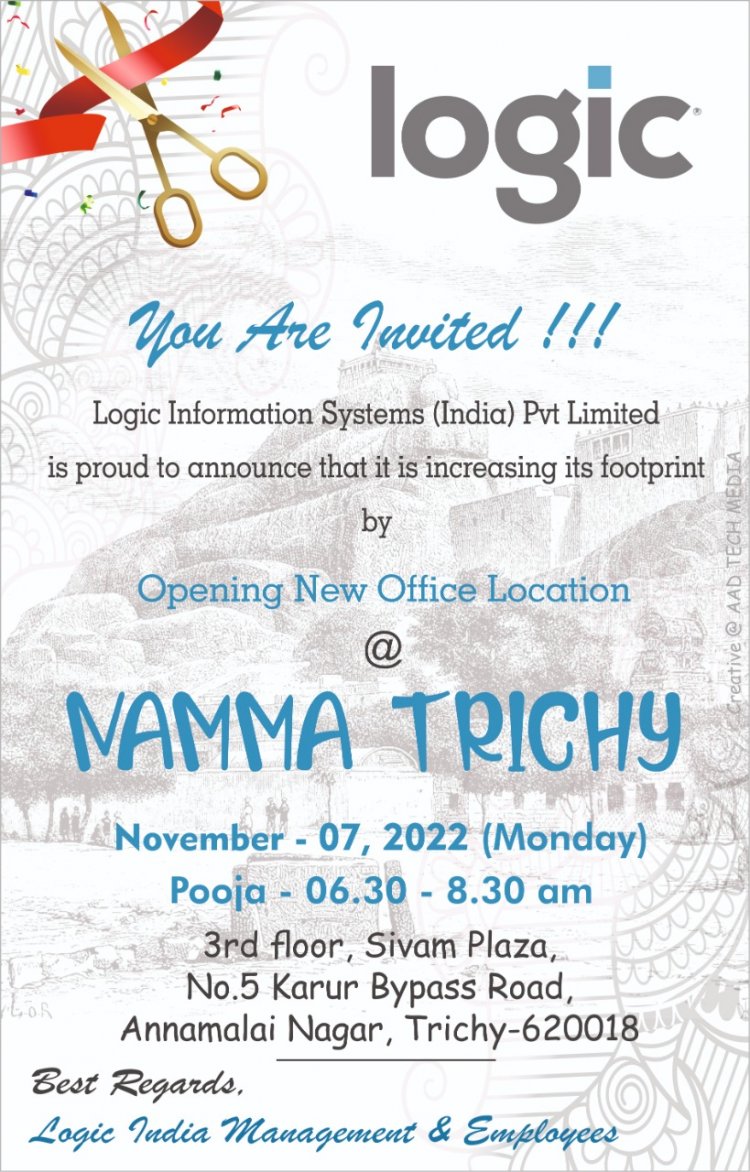 இந்தியாவில் லாஜிக் 2006 இல் நிறுவப்பட்டது, அதிலிருந்து எங்கள் குடும்பம் வெறும் 8ல் இருந்து 400+ ஆக வளர்ந்தது. லாஜிக் இந்தியா உலகின் மிகச் சிறந்த பயிற்சி பெற்ற மற்றும் மிகவும் திறமையான தொழில்நுட்பத் திறமையாளர்களின் தாயகமாக உள்ளது. பெங்களூரு சென்னையை தொடர்ந்து தற்பொழுது திருச்சியில் திருச்சியில் 3வது அலுவலகம் திறப்பு விழா நாளை நடைப்பெறுகிறது.
