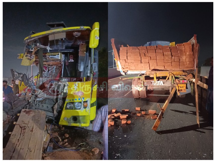 திருச்சி – சென்னை தேசிய நெடுஞ்சாலை பால்பண்ணை அருகே உள்ள மேம்பாலத்தில் சென்னையிலிருந்து கம்பம் நோக்கி 34 பயணிகளுடன் சென்ற தனியார் ஆம்னி பேருந்து சென்று கொண்டிருந்தது. அப்போது தர்மபுரியில் இருந்து புதுக்கோட்டை நோக்கி செங்கல் ஏற்றிக்கொண்டு சென்று கொண்டிருந்த லாரி பின்புறம் பேருந்து மோதி விபத்து ஏற்பட்டது.