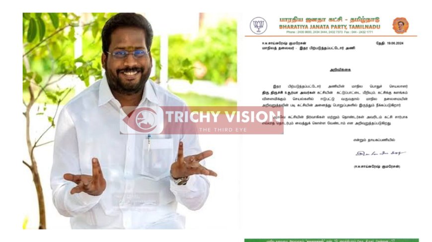 பாரதிய ஜனதா கட்சியின் இதர பிற்படுத்தப்பட்டோர் அணி மாநிலத் தலைவர் R.M.சாய்சுரேஷ் குமரேசன் வெளியிட்டுள்ள செய்தி குறிப்பில்…… இதர பிற்படுத்தப்பட்டோர் அணியின் மாநில பொதுச் செயலாளர் திரு. திருச்சி S.சூர்யா அவர்கள் கட்சியின் கட்டுப்பாட்டை மீறியும், கட்சிக்கு களங்கம் விளைவிக்கும் செயல்களில் ஈடுபட்டு வருவதால்