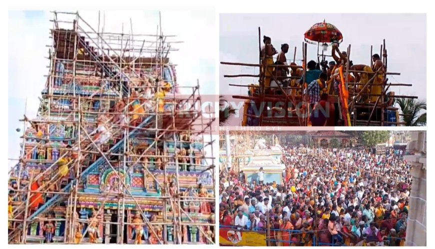 அப்போது கடம்புறப்பட்டு யாகசாலையில் வைத்து பூஜை செய்யப்பட்ட புனித நீரை சிவாச்சாரியார்கள் கோயில் கோபுர கலசத்திற்கு ஊற்றி கோயில் கும்பாபிஷேகத்தை செய்து வைத்தனர். விழாவில் முசிறி தொகுதி எம்எல்ஏ காடுவெட்டி தியாகராஜன், அறநிலையத்துறை அலுவலர்கள் உள்ளிட்ட பலர் கலந்துகொண்டனர்.