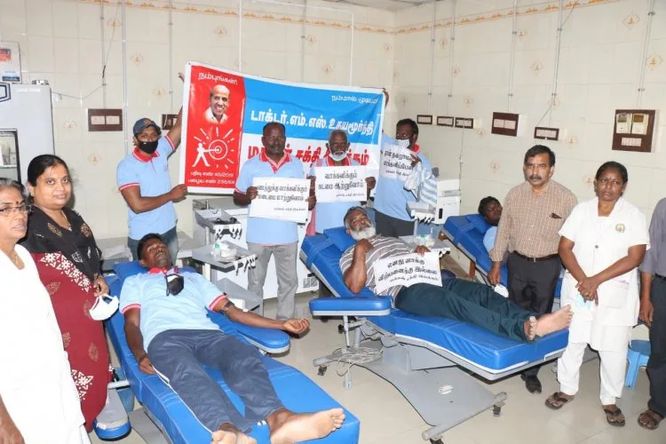 சட்டமன்ற தேர்தலை முன்னிட்டு 100 சதவீத வாக்குபதிவு வலியுறுத்தும் வகையில் மக்கள் சக்தி இயக்கம் இரத்ததான முகாமை ஏற்பாடு செய்திருந்தனர்.