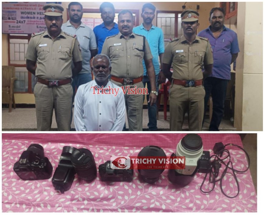 திருச்சி மாவட்டம் மணப்பாறையில் திருச்சி சாலையில் உள்ள இந்திரா திரையரங்கம் அருகில் ஓய்வு பெற்ற இரயில்வே பாதுகாப்புப்படை வீரர் முத்துப்பாண்டி என்பவர் போட்டோ ஸ்டுடியோ கடை வைத்து நடத்தி வருகிறார். கடையினை அவரது மகன் சந்தோஷ் நிர்வகித்து வந்த நிலையில் கடந்த (15.11.2022) அன்று இரவு கடையினை பூட்டிவிட்டு சென்ற சந்தோஷ் மறுநாள் காலை கடையினை திறக்க வந்த போது கடையின் பூட்டுகள் உடைக்கப்பட்டு ஷட்டர் திறந்து இருந்ததை கண்டு அதிர்ச்சியடைந்தார்.