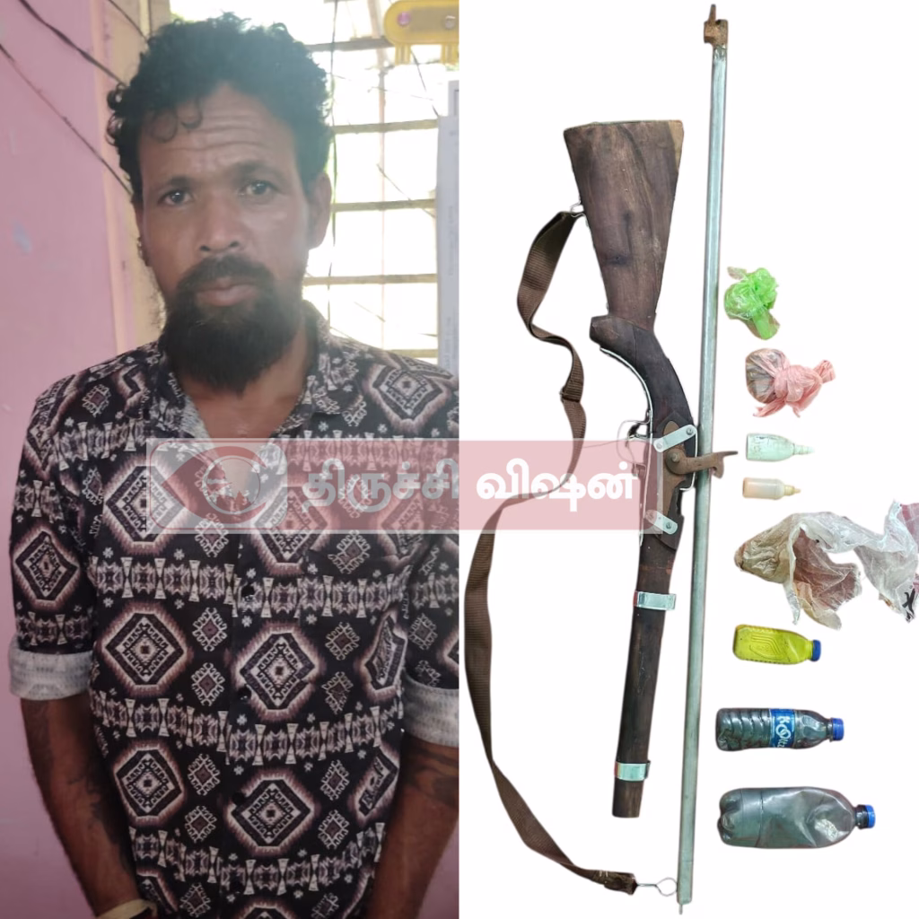 திருவெறும்பூர் அருகே உள்ள நவல்பட்டு பூலாங்குடி காலனிநரிக்குறவர் காலனி சேர்ந்தவர் அர்ஜுன் நம்பியார் ( 35 ) இவர் அரசு அனுமதி இல்லாமல் நாட்டு கை துப்பாக்கி வைத்திருப்பதாக நவல்பட்டு போலீசாருக்கு தகவல் கிடைத்தது அதன் அடிப்படையில் சம்பவ இடத்திற்கு விரைந்து சென்று அர்ஜுன் நம்பியாரிடம் இருந்து நாட்டு கை துப்பாக்கியை பறிமுதல் செய்ததோடு