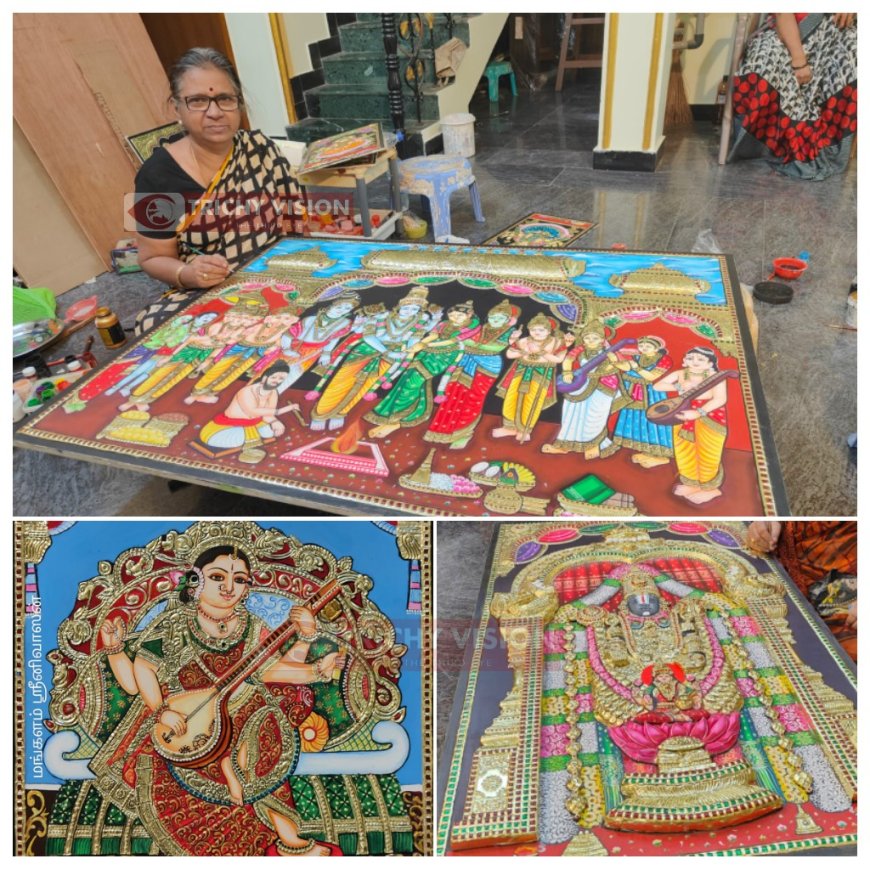 திருச்சி ஸ்ரீரங்கத்தில் அமைதியான சூழலில் அமைந்திருக்கிறது அவர்களின் வீடு, வீட்டுக்குள் நுழையும்போதே நம்மை வரவேற்கிறது அவரின் கைவண்ணத்தில் உருவான தஞ்சாவூர் ஓவியங்கள். கண்ணில் உயிர்ப்புடன் நம்மை வேறு எதிலும் கவனத்தை திருப்பிவிடாதவறு இருக்கும் ஓவியங்களுடன், கையில் பெயிண்ட் பிரஷ் கொண்டு வரைந்து கொண்டிருந்தார் மங்களம் ஸ்ரீனிவாசன் (60).