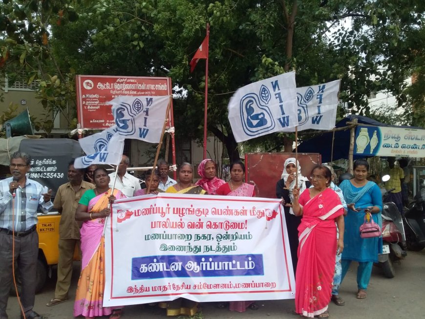 திருச்சி மாவட்டம் மணப்பாறை தந்தை பெரியார் சிலை அருகே இந்திய மாதர் தேசிய சம்மேளனம் சார்பில் மணிப்பூரில் பழங்குடி பெண்கள் மீது அரங்கேறும் பாலியல் வன்கொடுமையை வேடிக்கை பார்க்கும் மத்திய, மாநில அரசுகளை கண்டித்து இந்திய மாதர் தேசிய சம்மேளனம் சார்பில் கண்டன ஆர்ப்பாட்டம் நடைபெற்றது.