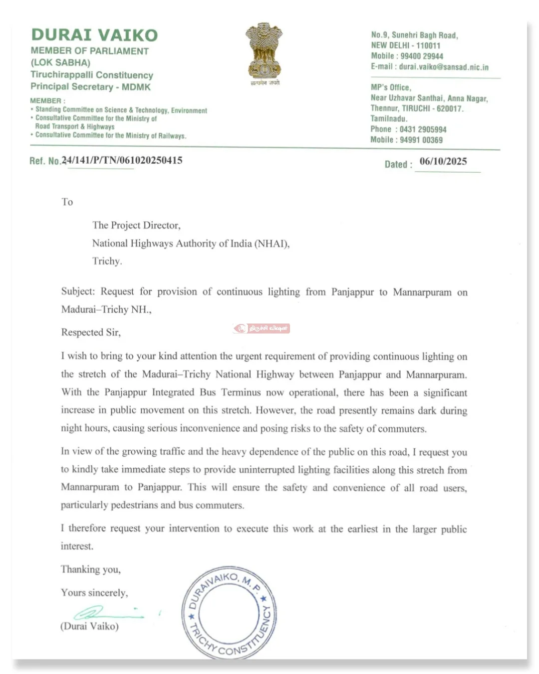 திருச்சி மாவட்ட ஆட்சியர் அலுவலகத்தில் கடந்த ஜூன் 10 – ஆம் தேதி எனது தலைமையில் நடைபெற்ற மாவட்ட வளர்ச்சி – ஒருங்கிணைப்பு மற்றும் கண்காணிப்புக் குழு (DISHA) கூட்டத்தினைத் தொடர்ந்து, நடைபெற்ற சாலை பாதுகாப்புக் குழு கூட்டத்தில், திருச்சி மன்னார்புரம் முதல் பஞ்சப்பூர் வரை சாலை விளக்குகள் அமைக்குமாறு நான் தேசிய நெடுஞ்சாலை ஆணையத்திடம் (NHAI) வலியுறுத்தினேன்.