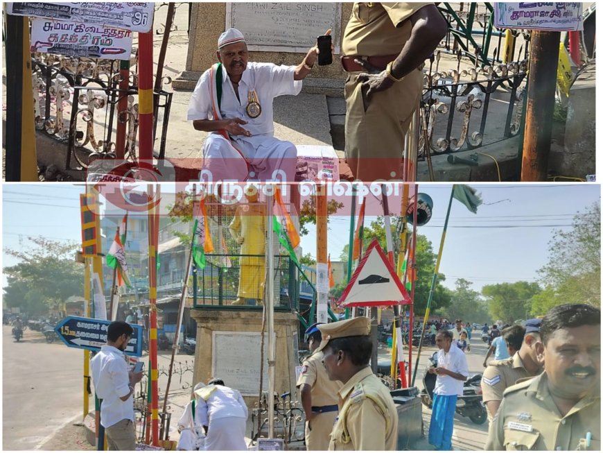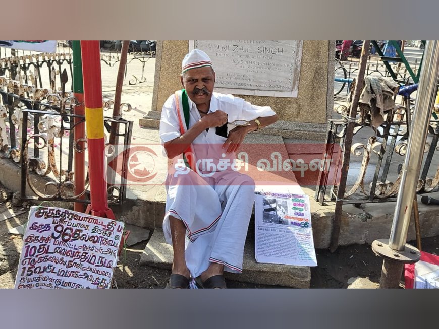 திருச்சி மாவட்டம்,மணப்பாறை சேதுரத்தினபுரத்தை சேர்ந்தவர் சுதந்திர போராட்ட தியாகி சுந்தரம் (96) இவர் சுதந்திர போராட்டங்களில் கலந்து கொண்டததிற்காக தியாகி பென்சன் உள்பட அரசு சலுகைகள் கிடைத்துக் கொண்டு உள்ளது. இந்நிலையில் இன்று காலை கோவில்பட்டி சாலையில் உள்ள காமராஜர் சிலை முன்பு அமர்ந்து தியாகி சுந்தரம் போராட்டத்தில் ஈடுபட்டார்.
