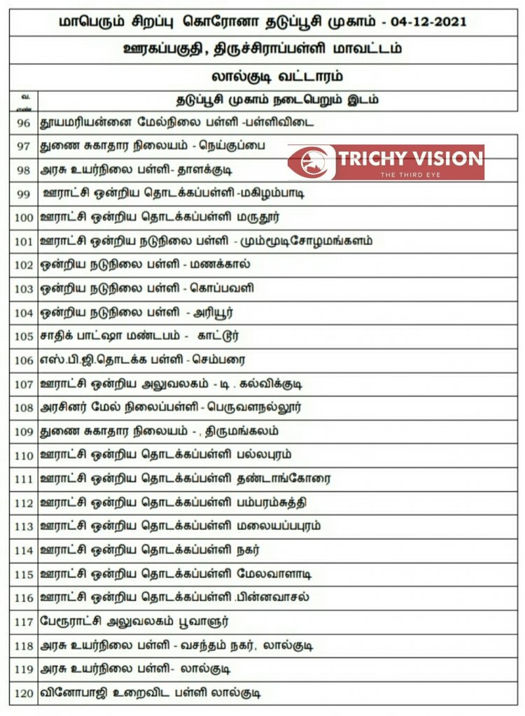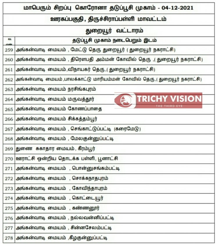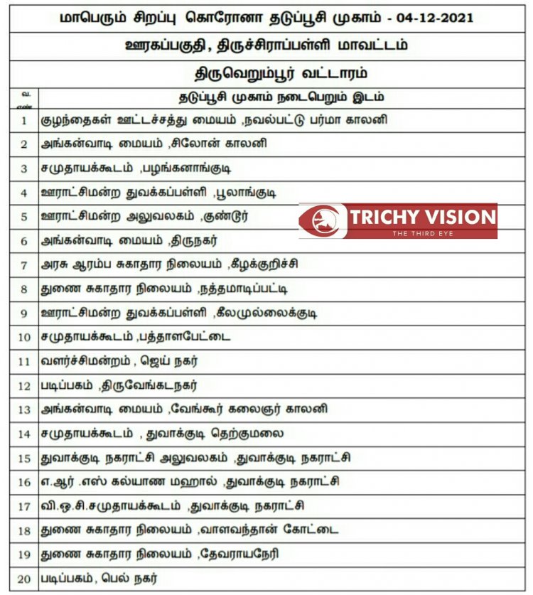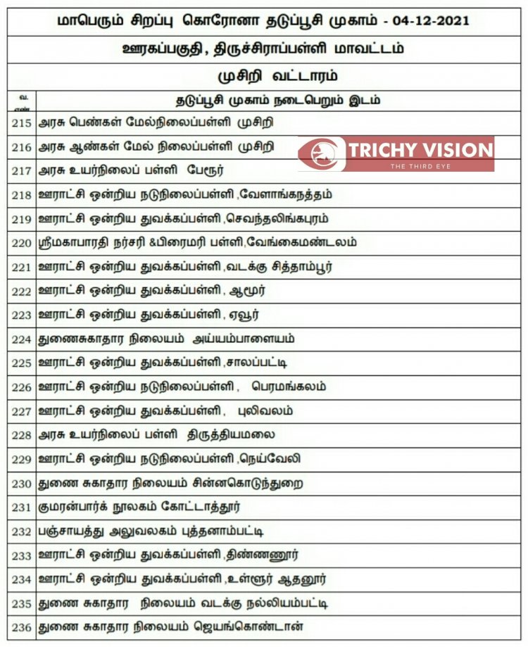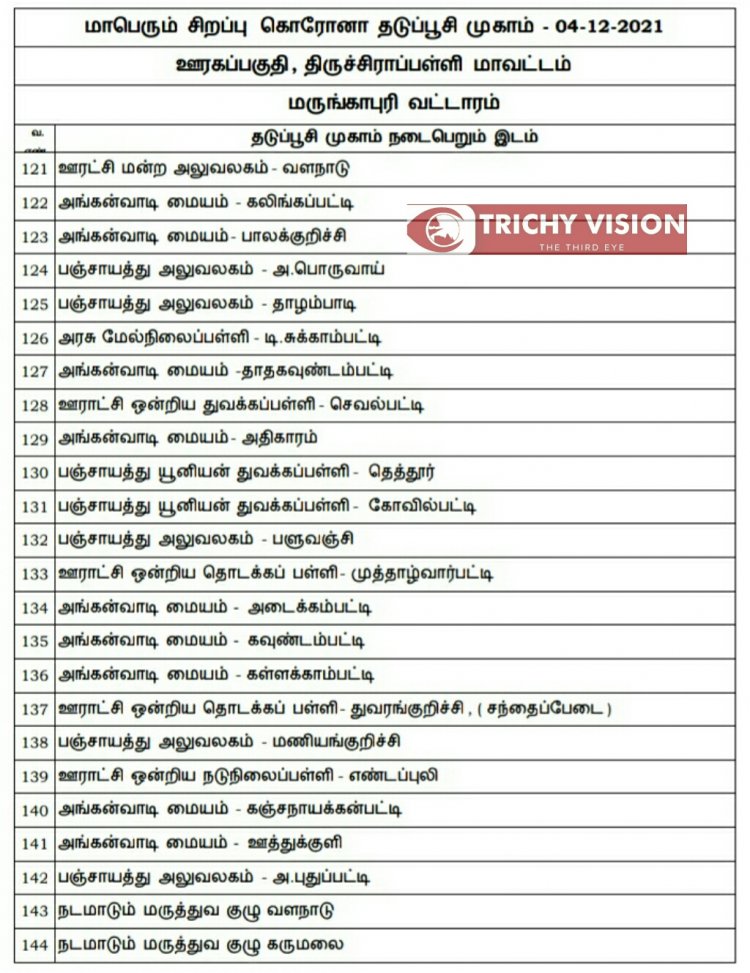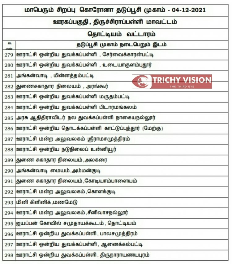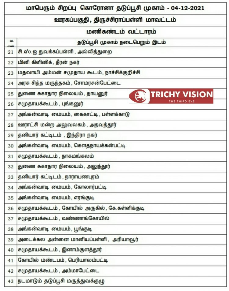 திருச்சி மாவட்டத்தில் இன்று (04.12.2021) கோவிசீல்டு, கோவாக்சின் தடுப்பு ஊசிகள் போடப்படும் இடங்களை மாவட்ட நிர்வாகம் அறிவித்துள்ளது.