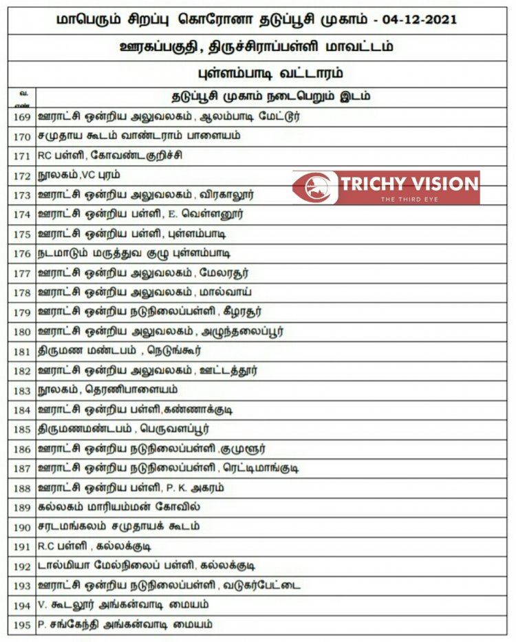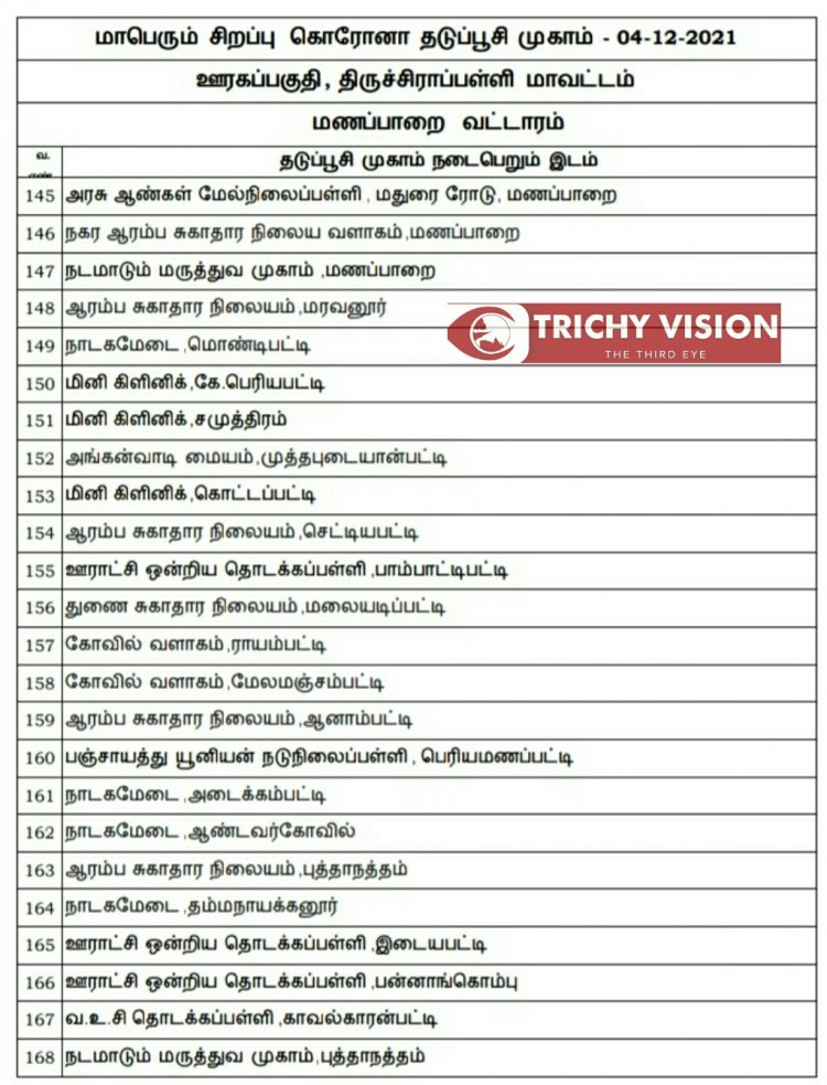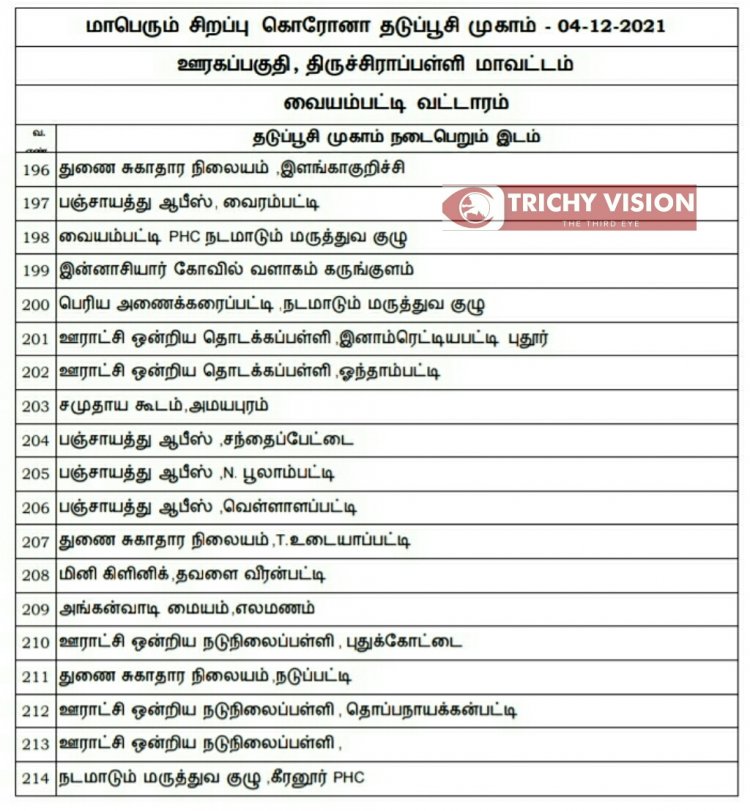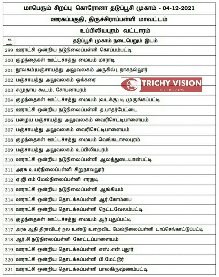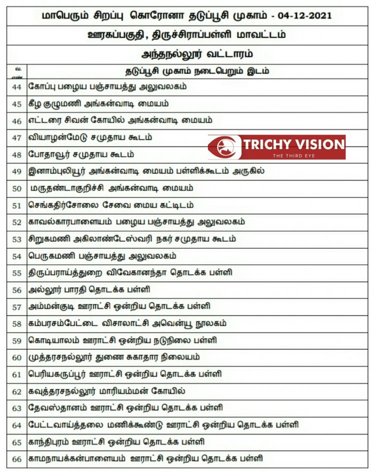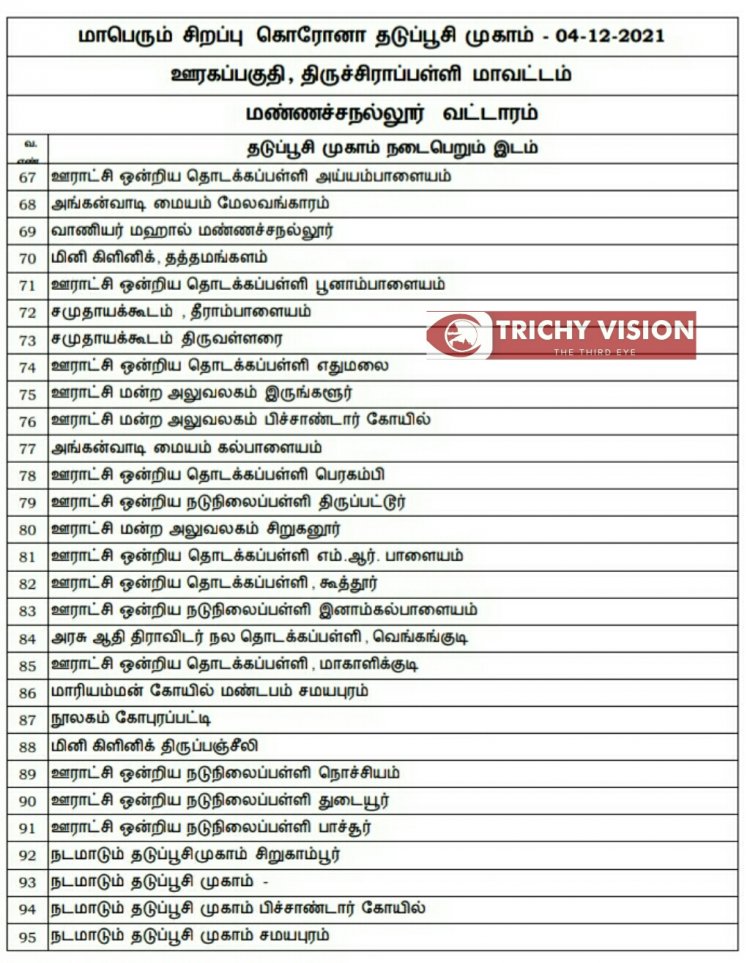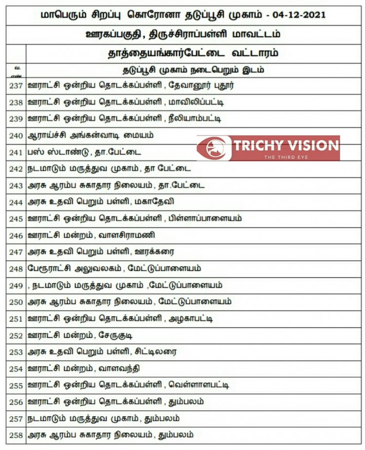 திருச்சி மாவட்டத்தில் இன்று (04.12.2021) கோவிசீல்டு, கோவாக்சின் தடுப்பு ஊசிகள் போடப்படும் இடங்களை மாவட்ட நிர்வாகம் அறிவித்துள்ளது.