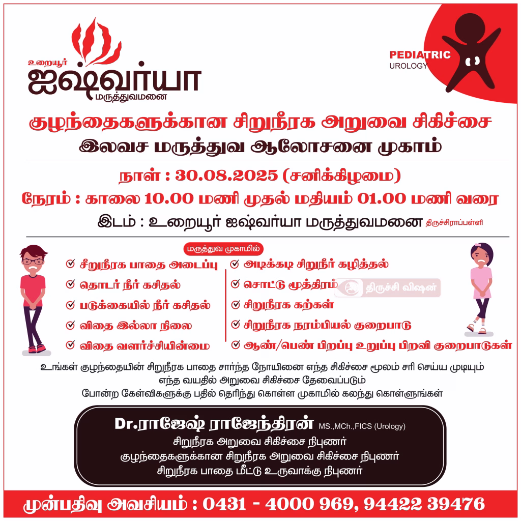 உறையூர் ஐஸ்வர்யா மருத்துவமனை நடத்தும் மாபெரும் இலவச குழந்தைகளுக்கானசிறுநீரக மருத்துவ அறுவை சிகிச்சை முகாம்