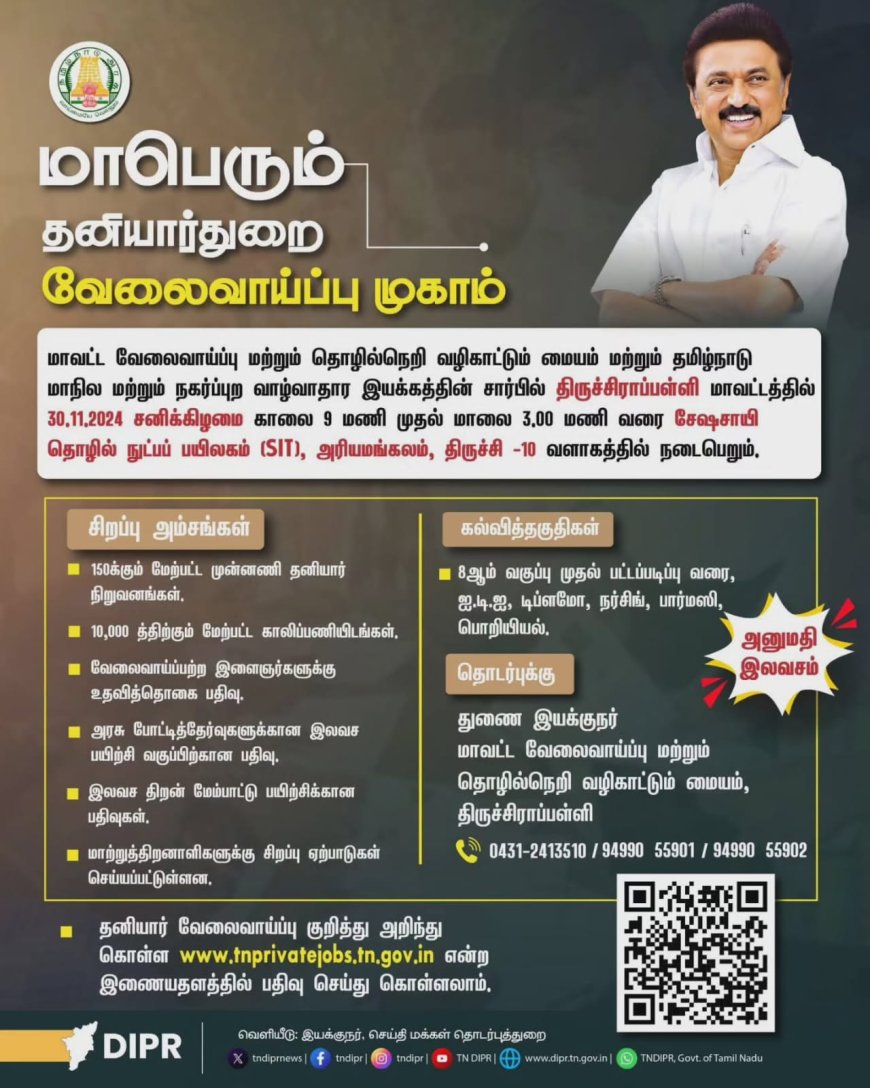 திருச்சிராப்பள்ளி மாவட்டத்திலுள்ள வேலைநாடுநர்களை தனியார் துறைகளில் பணியமர்த்தும் நோக்கத்தோடு, திருச்சிராப்பள்ளி மாவட்ட நிர்வாகம் மற்றும் மாவட்ட வேலைவாய்ப்பு மற்றும் தொழில்நெறி வழிகாட்டும் மையம் இணைந்து நடத்தும் மாபெரும் தனியார் துறை வேலைவாய்ப்பு முகாம் (30.11.2024) சனிக்கிழமை அன்று திருச்சிராப்பள்ளி, அரியமங்கலம் சேஷசாயி தொழில்நுட்ப பயிலகத்தில் (SIT) காலை 9:00 மணி முதல் பிற்பகல் 3:00 மணி வரை நடைபெறவுள்ளது.