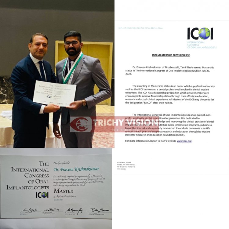 கொச்சினில் நடந்த சர்வதேச வாய்வழி உள்வைப்பு (ஓர் இம்பிளாண்டோலஜி) கூட்டமைப்பு நிகழ்ச்சியில் திருச்சி மண்டல பல் அறுவை சிகிச்சை மருத்துவர் பிரவீன் குமாருக்கு மாஸ்டர் ஷிப் விருது வழங்கப்பட்டது. ஆசிய கண்டத்திலிருந்து 300 பல் அறுவை சிகிச்சை மருத்துவர்கள் கலந்து கொண்டனர்.