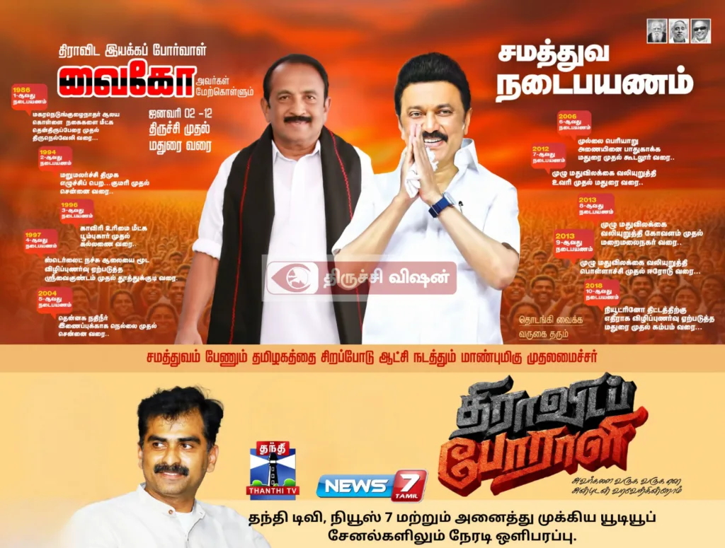 திராவிட இயக்கத்தின் நீண்டகால அரசியல் வரலாறையும், சமூக நீதி, சமத்துவம், சுயமரியாதை போன்ற அடிப்படை கொள்கைகளையும் பொதுமக்களிடையே மீண்டும் வலியுறுத்தும் வகையில் ஜனவரி 02 முதல் 12 வரை திராவிட இயக்கப் போர்வாள் வைகோ அவர்கள் மேற்கொள்ளும் “சமத்துவ நடைப்பயணம்” திருச்சி முதல் மதுரை வரை முன்னெடுக்கப்படுகிறது.