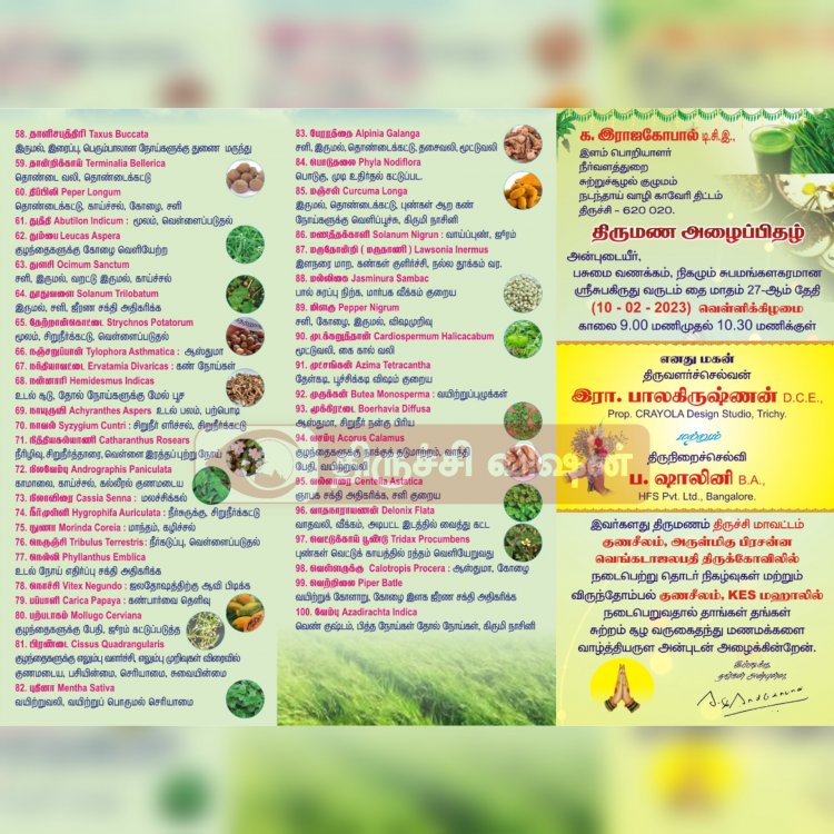 அவ்வகையில் திருச்சியை சேர்ந்த பாலகிருஷ்ணன் ஷாலினி என்ற மணமக்கள் தங்களது திருமண பத்திரிக்கையில் மூலிகையும் மருத்துவ குணங்களும் என்று 100 மருத்துவ குணம் நிறைந்த மூலிகைகள் குறித்து அச்சடித்துள்ளனர். அதிமதுரம் – தீரும் நோய்கள்: இருமல் வயிற்றுப்புண் சுவையின்மை போன்றவற்றிற்கு சிறந்த மருத்துவ தாவரமாகும்.