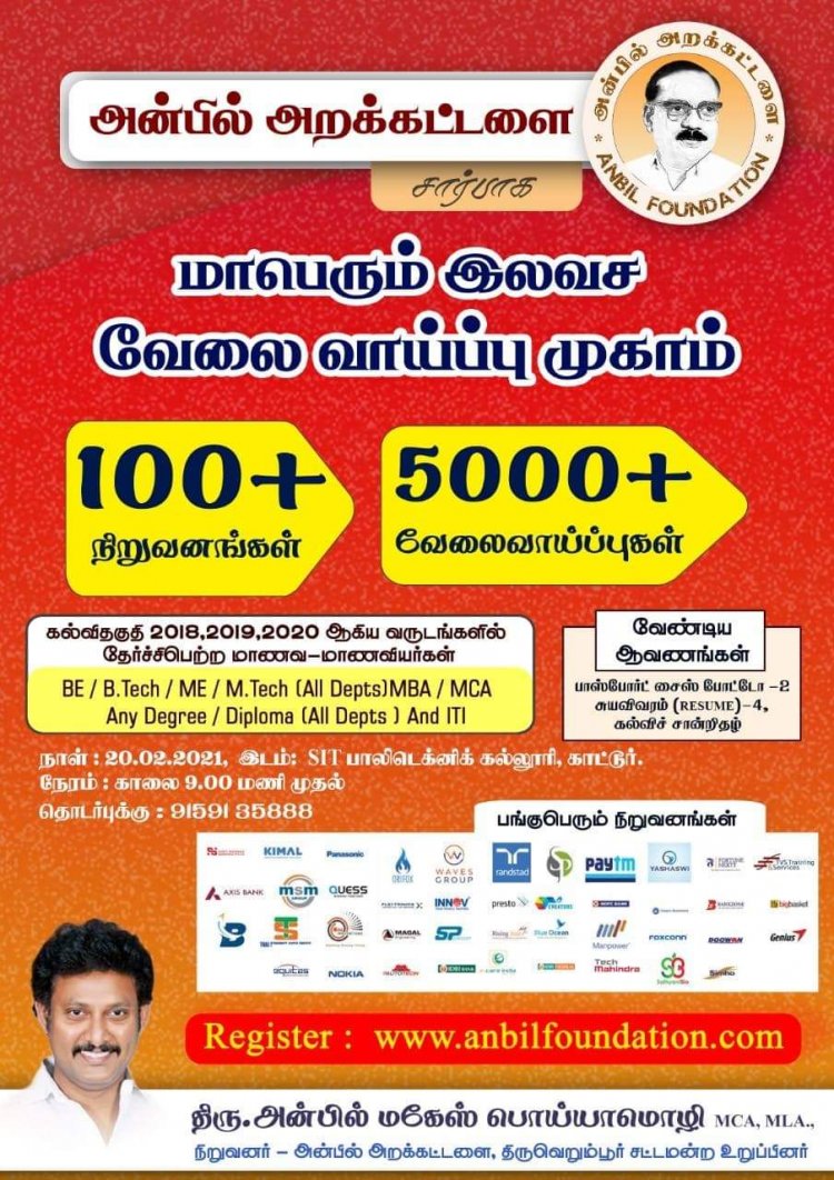 வேலை வாய்ப்பு முகாமில் கலந்து கொள்ளும் மாணவ, மாணவிகள் www.anbilfoundation.com என்ற இணையதளத்தில் முன்பதிவு செய்து, நேர்முக தேர்விற்கு வரும்போது, முன்பதிவு செய்த விண்ணப்பத்தை கொண்டு செல்லவும்.