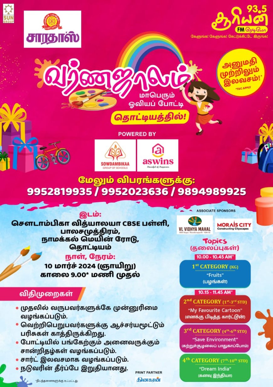 சூரியன் எப் எம் சார்பில் பள்ளி மாணவர்களுக்கென மெகா ஓவியப் போட்டி வருகிற (10.03.2023) நடைபெற உள்ளது. திருச்சி மாவட்டம் தொட்டியம், பாலசமுத்திரம் பகுதியிலுள்ள சௌடாம்பிகா வித்யாலயா CBSE பள்ளியில் நடைபெற உள்ள இந்த ஓவியப்போட்டில், பள்ளி மாணவர்களின் திறமையை வெளிக்கொண்டு வரும் நோக்கில் தொடங்குகிறது.