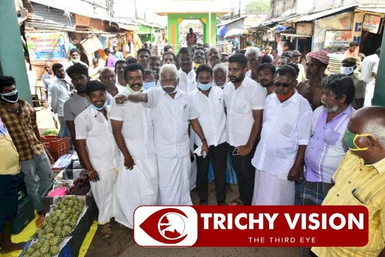 திருச்சி காந்தி மார்க்கெட்டிலுள்ள வியாபாரிகளை தமிழ்நாடு வணிகர் சங்க பேரவை தலைவர் வெள்ளையன் சந்தித்துப் பேசினார். முன்னதாக அவர் அங்குள்ள காந்தி சிலைக்கு மாலை அணிவித்து மரியாதை செலுத்தினார்.