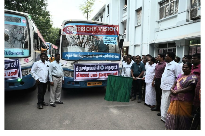 மிக்ஜாம் புயல் நிவாரண பணிக்கு சென்னைக்கு திருச்சிராப்பள்ளி மாநகராட்சி மூலம் 250 தூய்மை பணியாளர்கள் மற்றும் 10 தூய்மை பணி மேற்பார்வையாளர்கள், மூன்று சுகாதார அலுவலர்கள் வெள்ள தடுப்பு உபகரணங்களுடன் ஐந்து பேருந்துகள் மூலம் இன்று மேயர் மு. அன்பழகன், மாநகராட்சி ஆணையர் மரு.இரா.வைத்திநாதன் ஆகியோர் கொடி அசைத்து வழி அனுப்பி வைத்தனர்.